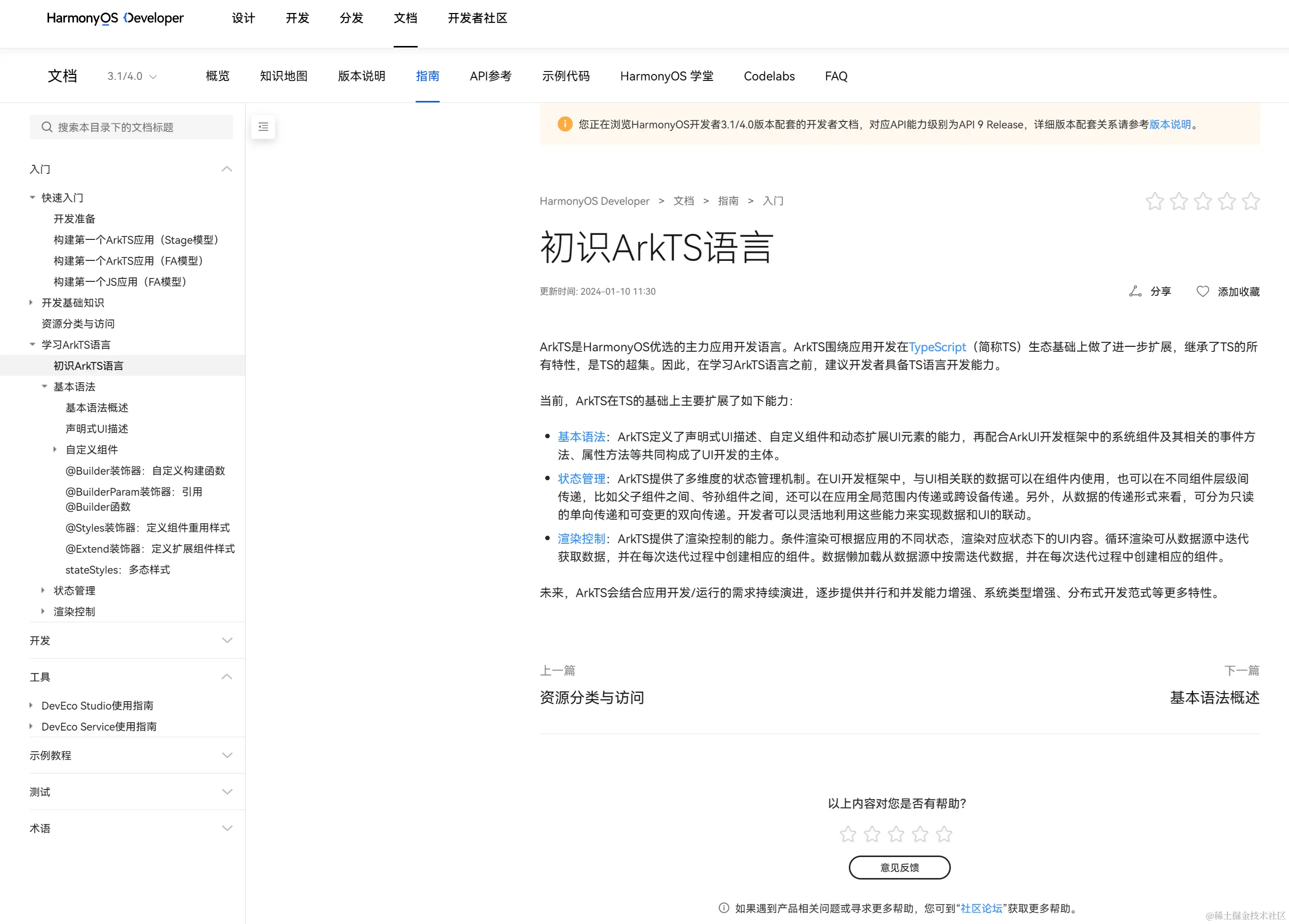 页面上面的一行淡黄色的小字,告诉我们这个文档是鸿蒙 3.1/4.0 共用的。这也让我注意到文档边上的版本下拉框: