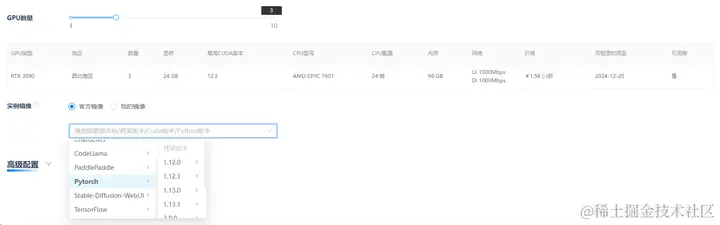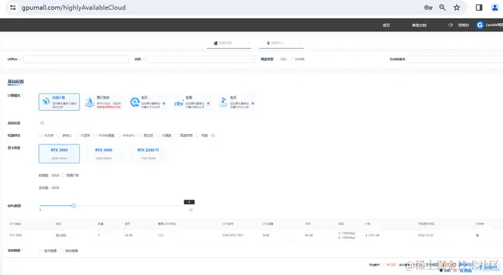 平台提供来自英伟达、AMD等多家大厂的芯片,兼顾着最新和最热门的机型。用户可以根据自己的模型大小,按照所需的机器特性,例如需求数量、显存大小等信息来筛选所需的机型;实例创建根据数据量级和运算速率和安全性进行了社区云和高可用云的区分;