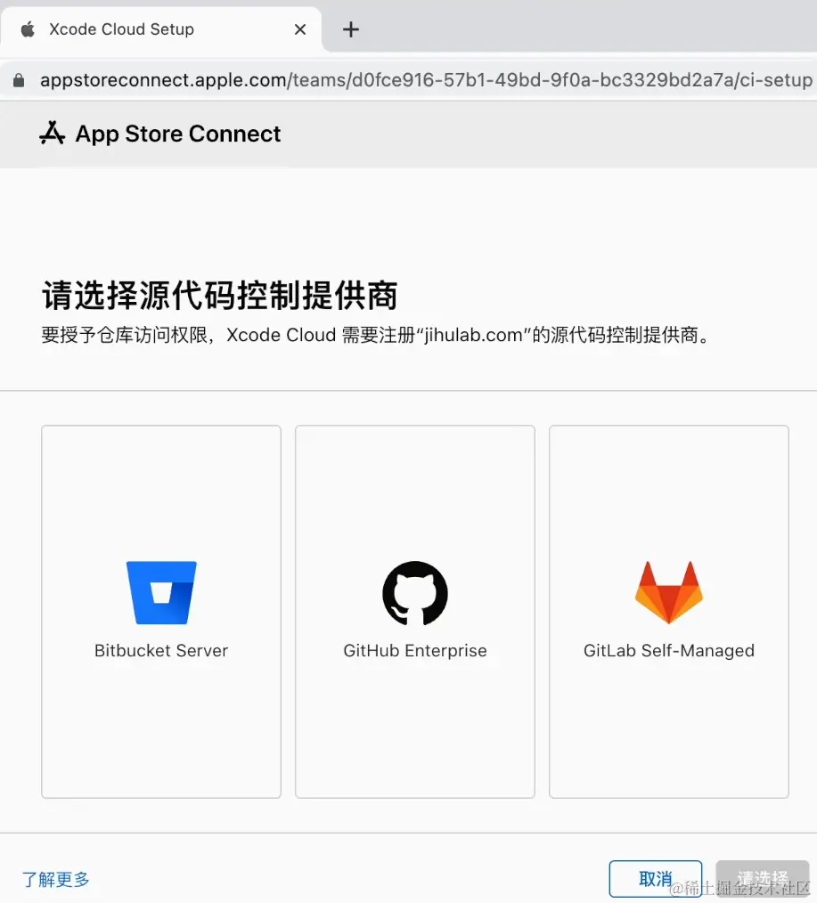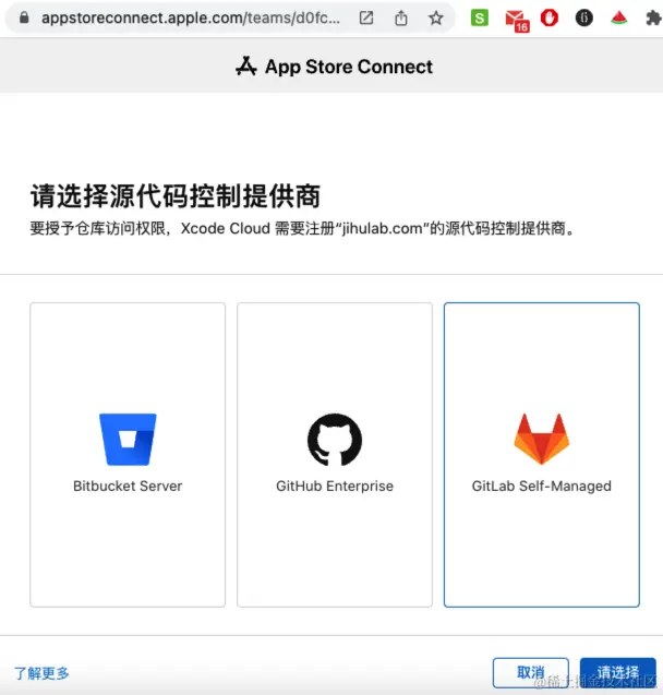 作为持续集成,首先要对接代码库,Xcode Cloud 支持 3 家全球知名的代码库: