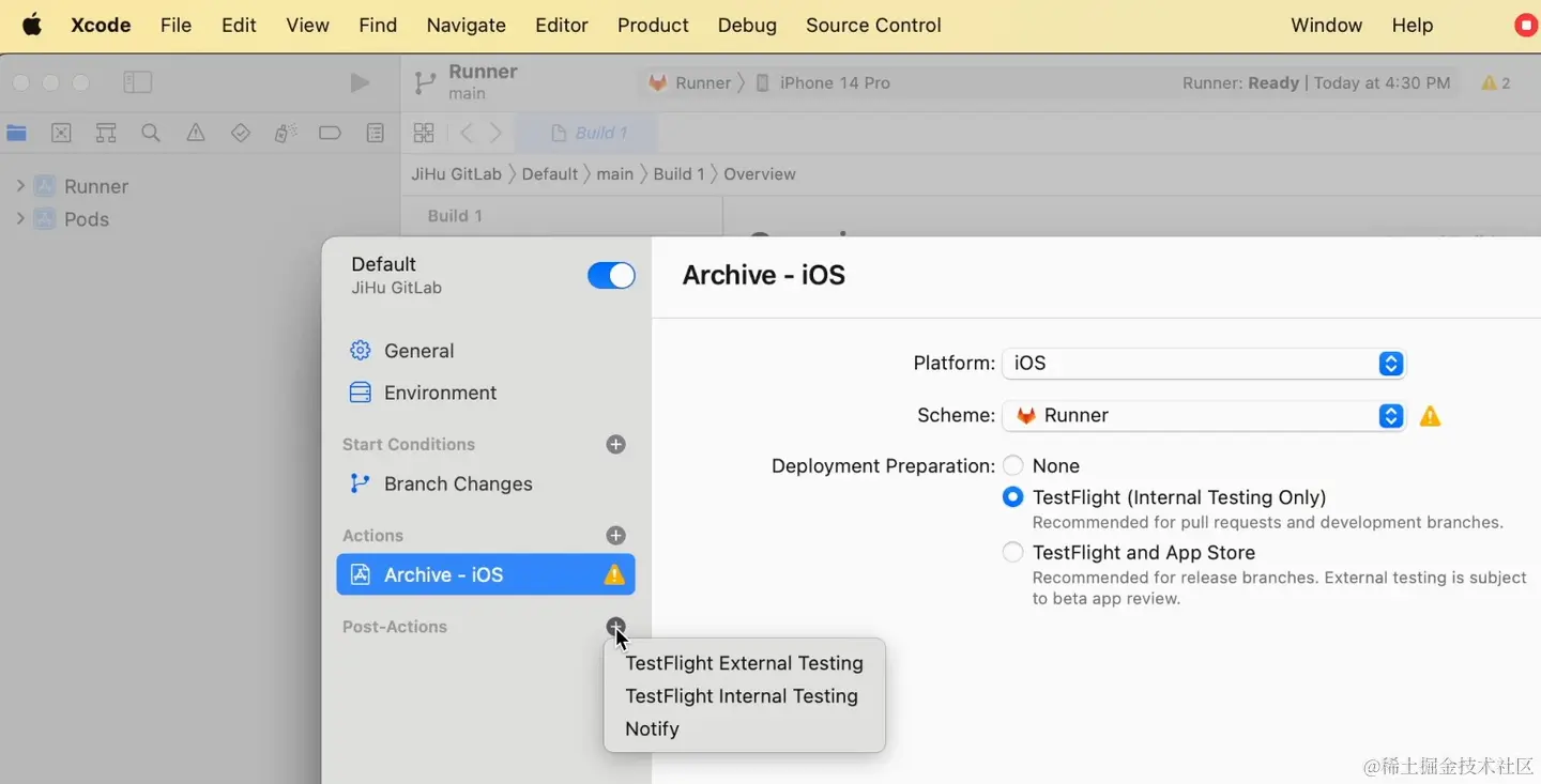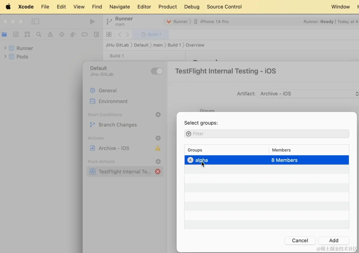- Post-Actions——》Add——》Testflight Internal Testing——》Groups——》Add group(需要先在 Testflight 网页上创建测试组)