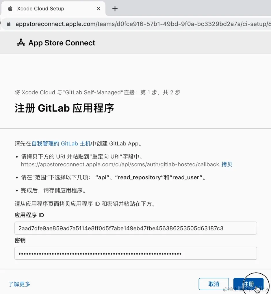 创建成功,获得「应用程序 ID」和「密码」,填写到 Apple 网站上,点击下一步进行授权。