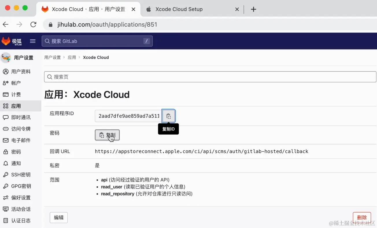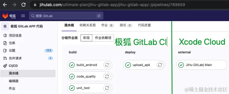 - 高级设置:在极狐 GitLab CI 里扫描代码规范、打包 Android,在 Xcode Cloud 里打包 iOS。