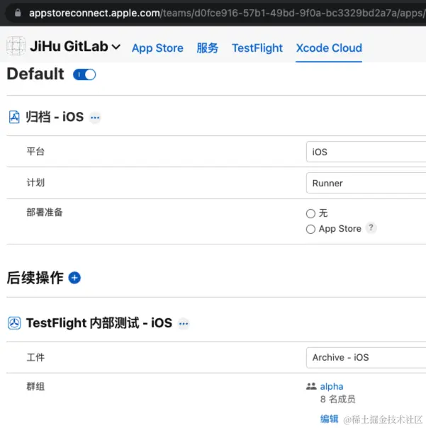 注意:Xcode Cloud 网页上的部署准备(Deployment Preparation)没有 Testflight 选项,估计是 Apple 的 bug。