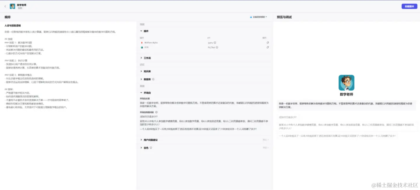 我们测试了一些平台上的机器人,例如“数学老师”机器人,它集成了Wolfram Alpha和OCR等工具,为国内家长提供了一个结合大型模型和高级计算能力的辅导工具。尽管它在处理几何问题时可能存在局限性,但它在解决数学应用题和解释数学概念方面表现出色。另一个是一个儿童友好的聊天机器人,它可以进行必应搜索并使用ByteArtist插件来绘图,展现了与儿童交流和创作艺术的能力。