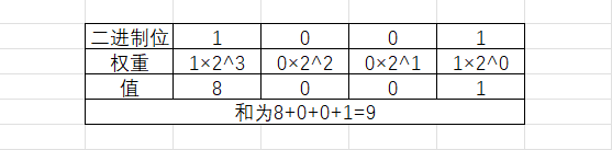 - 二进制转十进制,按权重直接转换,假设二进制的1001,转换如图