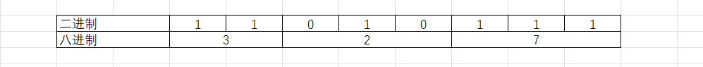 - 二进制转八进制,从右往左每三个二进制转换为一个八进制位,最后不够直接转为八进制。以二进制11010111为例