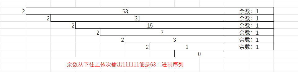 - 十进制转换为二进制,可以利用除法取余。如图为63转换为二进制的过程