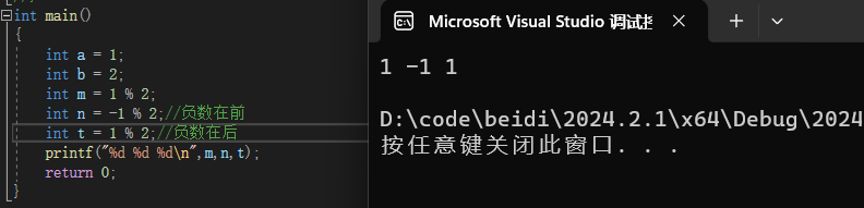 负数求模的规则是,结果的正负号由第⼀个运算数的正负号决定。