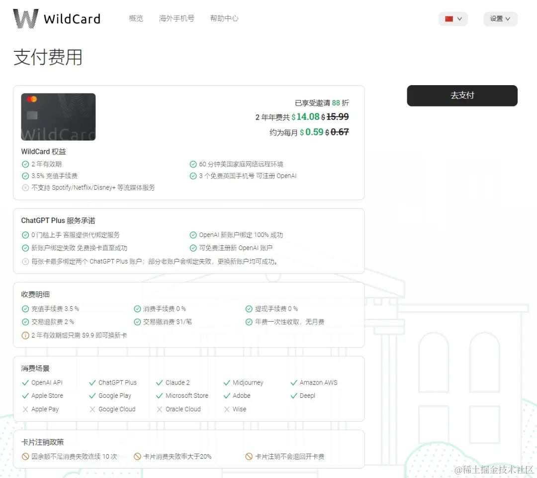 - WildCard 本质上是其实就是一种虚拟借记卡,开卡后余额为 0,如果不充值是无法扣费使用的,所有需要在充值后再进行订阅/支付。