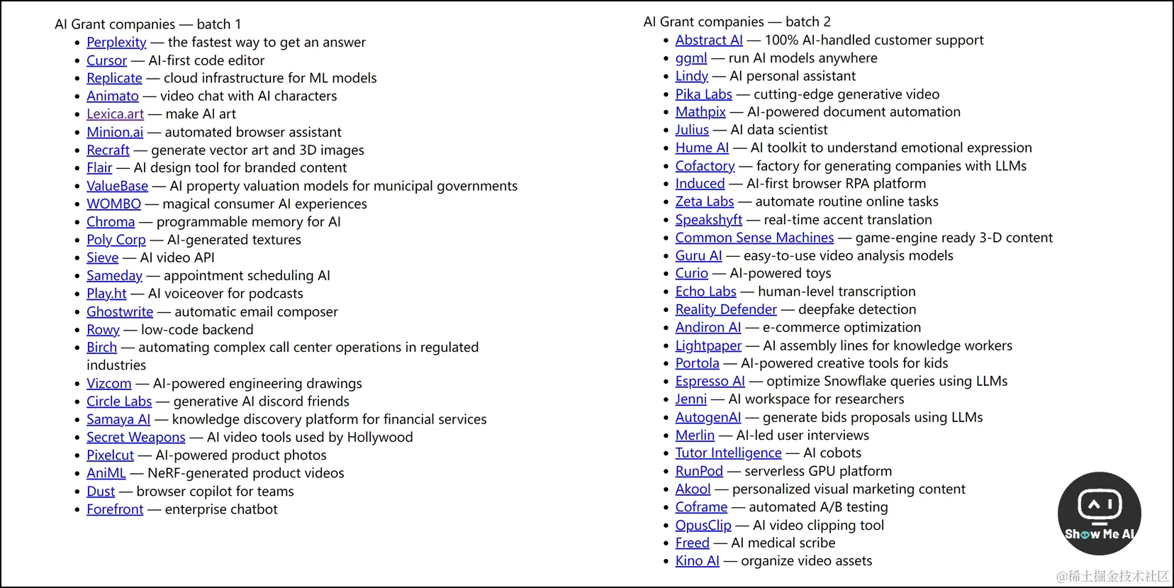 上图已经完成的前两轮投资中,我们可以看到非常多熟悉的名字:Perplexity、Cursor、Replicate、Lexica.art、Pika Labs…… 足可以见 AI Grant 的命中率有多高了!