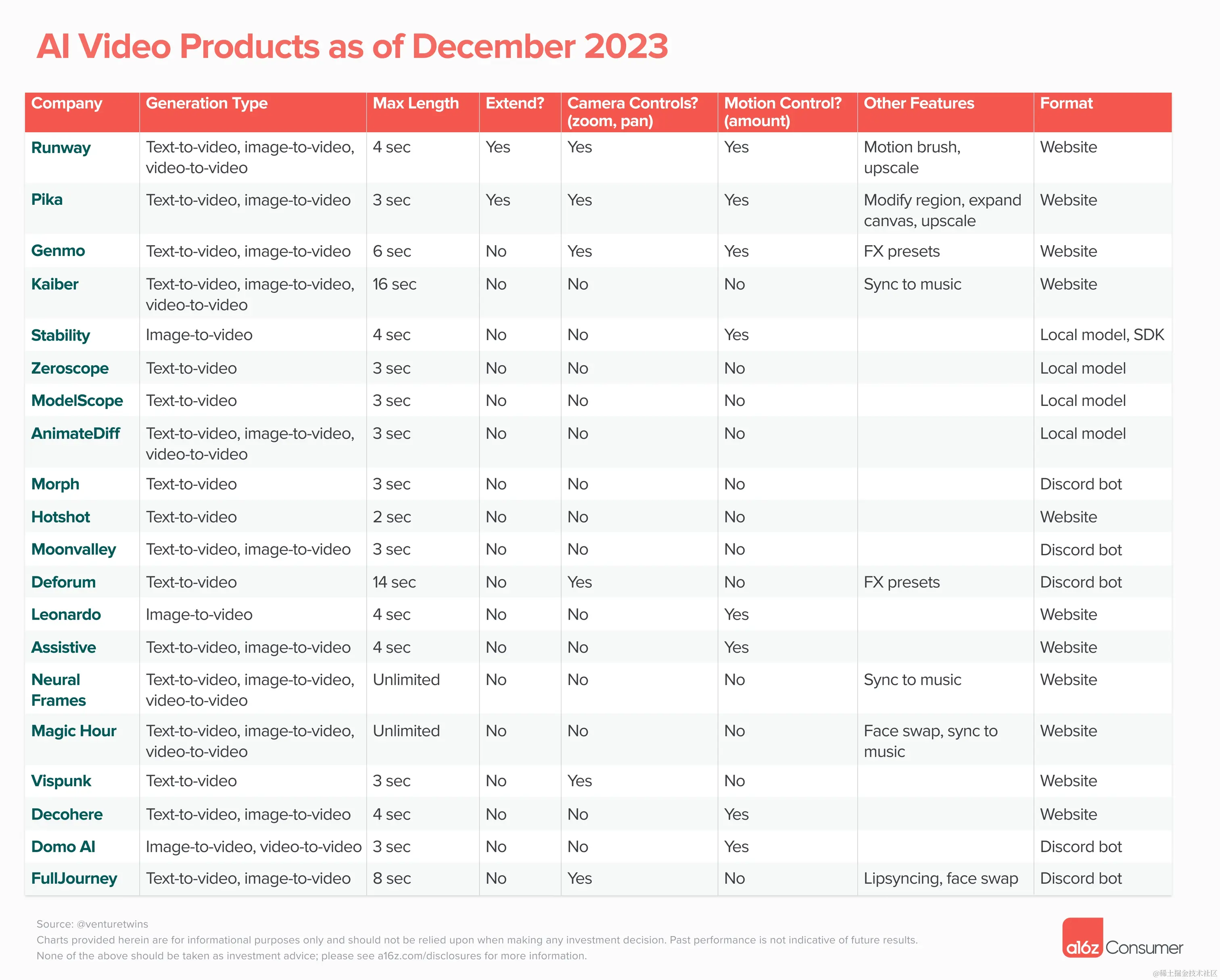 这篇文章作者追踪了21款AI视频产品,包括我们都很熟悉的 Runway、Pika、Genmo、Leonardo等等,并把产品特性汇总成上方 👆 表格。