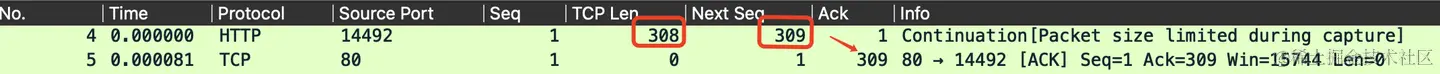 5号包的Ack=309=4号包seq+tcpLen=4号包nextSeq,就是表示收到4号包的内容
