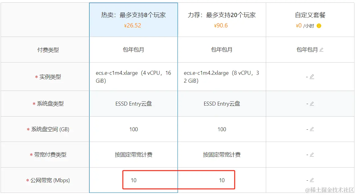 - 选择配置,一般来说配置越高越流畅。这游戏比较吃内存,官方的推荐配置是4核16G,带宽方面推荐不限流量的固定带宽,延时低,畅玩体验更佳,这里的10M带宽完全够用。