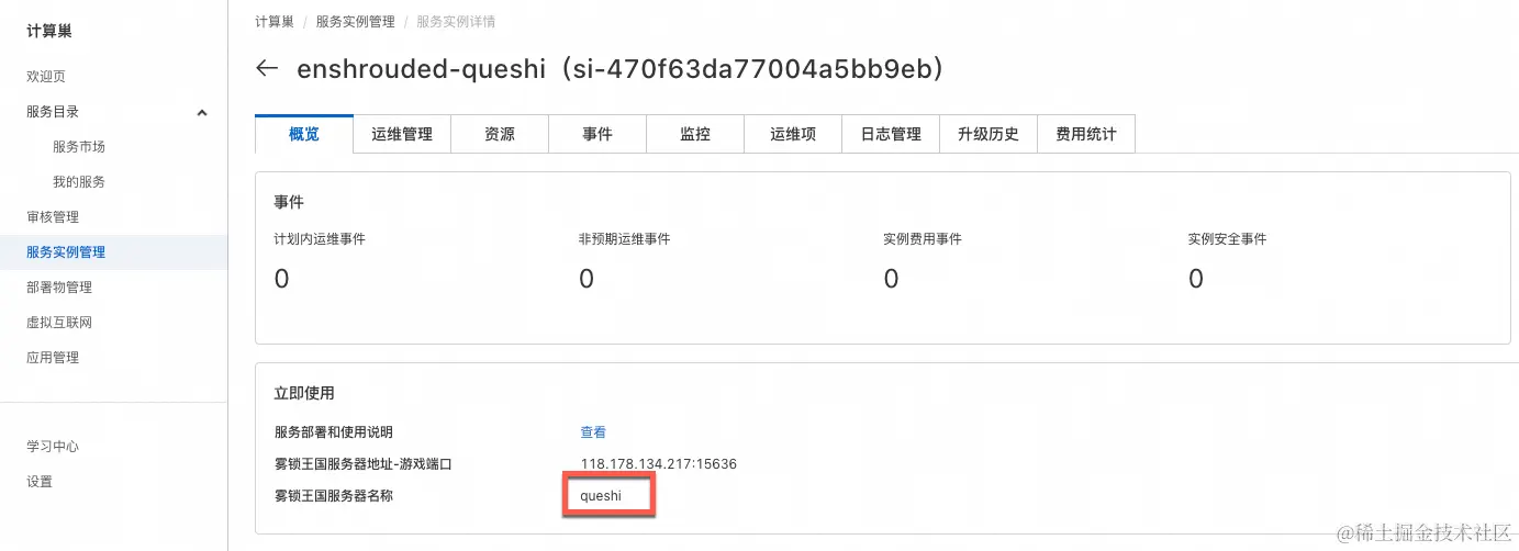 如果你忘了游戏服务器的名称,可以单击服务实例ID进入详情页查看。