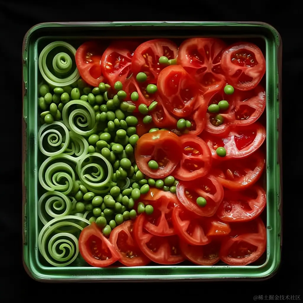 盘中切片的番茄和毛豆,迷人的光学幻觉风格,服部直人风格,点状,翻滚波,动力雕塑,雅内克·塞德拉尔,鸟瞰视角