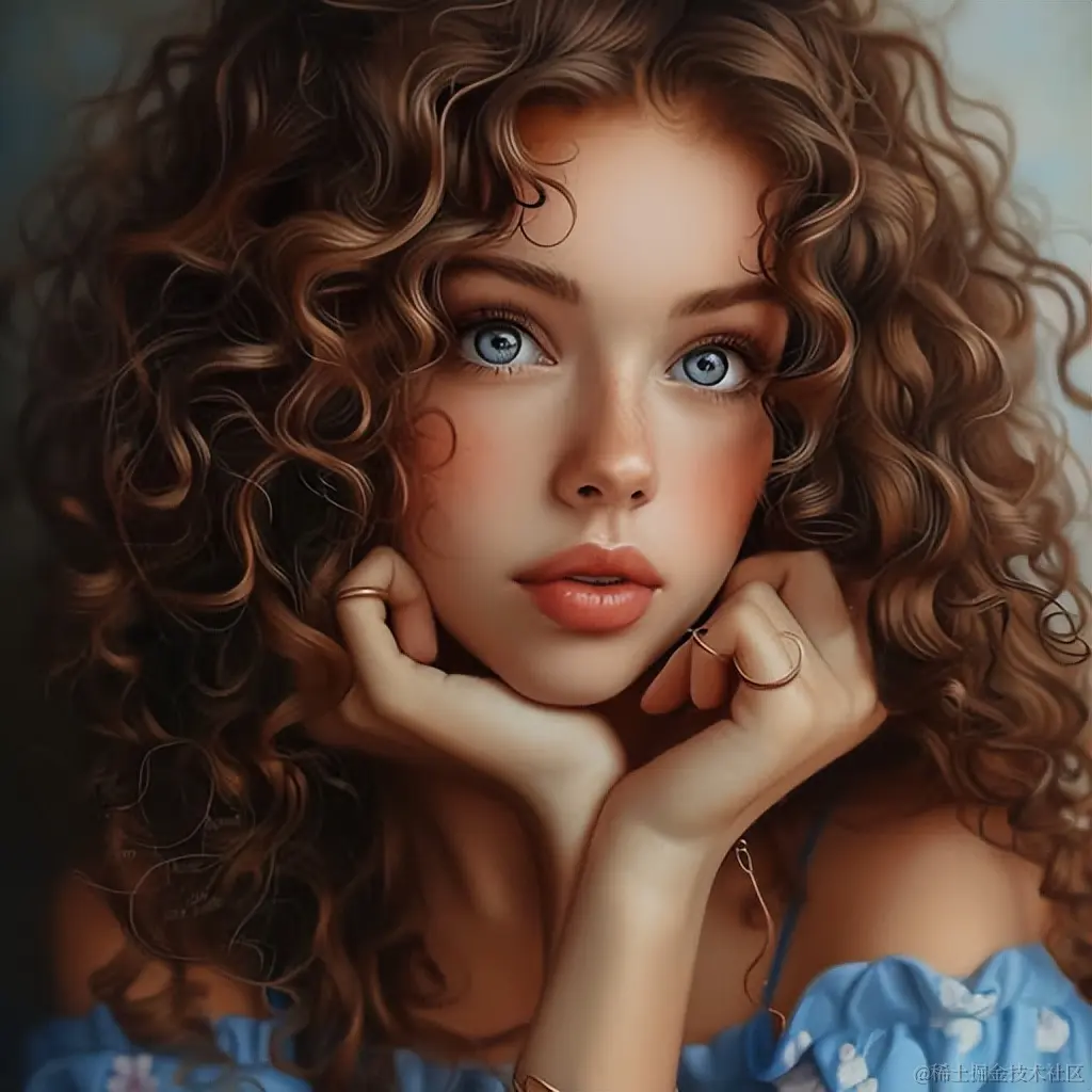a young woman with curly hair is posing, in the style of photo-realistic techniques, distinct facial features, magali villeneuve, uhd image, realistic depictions of human form, light gray and blue --ar 3:4 --v 6.0