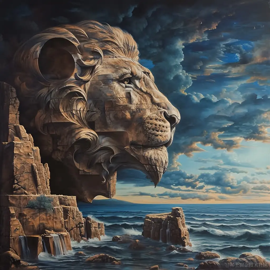 俯瞰岩石岛的狮子头绘画,未来主义雕塑风格,逼真图像,雕塑家,浪漫主义,独特的鼻子,深天蓝和浅棕色,夸张表达