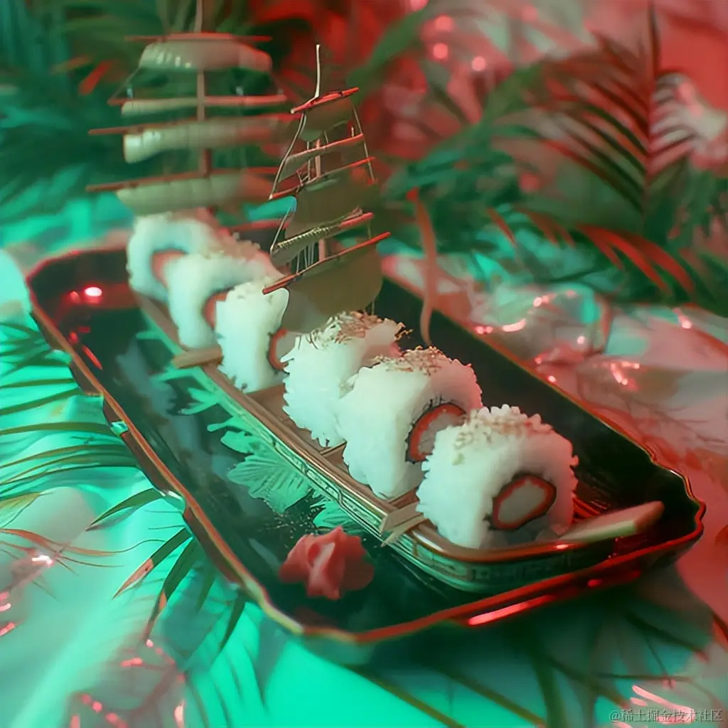 a tray of rice with sushi in the shape of small ship, in the style of digital airbrushing, green and emerald, filip hodas, piratepunk, relief sculpture, diana f+, tropical symbolism