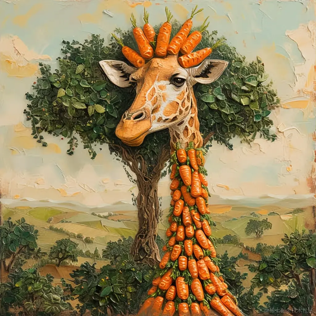 胡萝卜树米饭长颈鹿美食艺术创意,大胆纹理风格,基思·卡特风格,冒险主题,康尼卡大迷你,蜗牛核心,矩形领域,创作共用署名