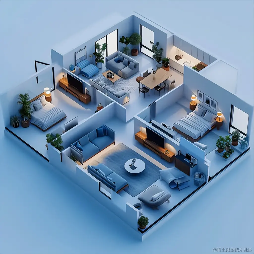 带家具和房间的公寓3D模型,航拍风格,浅靛蓝和海军蓝,地中海灵感,高角度,宁静的花园风景,逼真渲染,透明度和半透明度