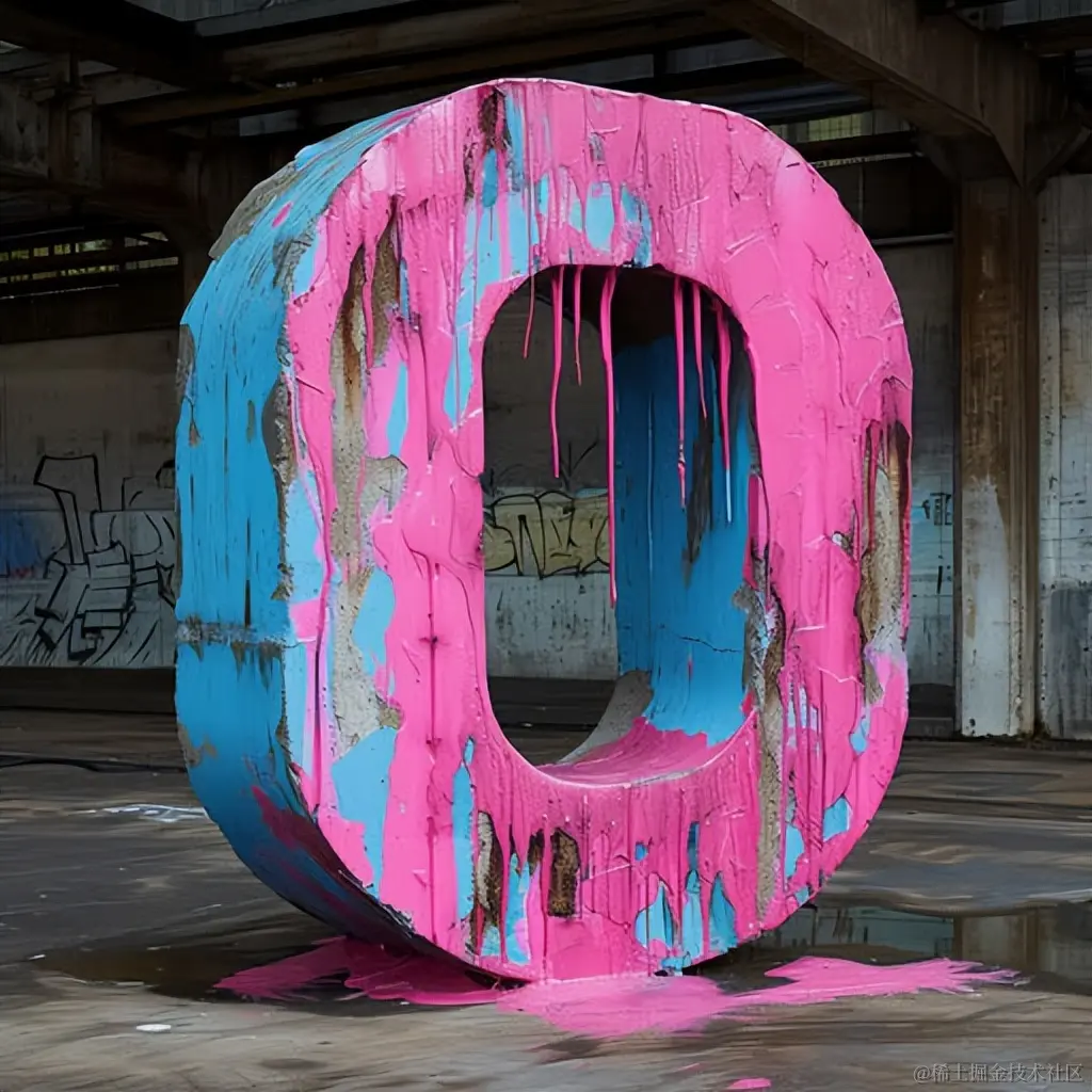 涂有蓝色油漆的混凝土字母O,浅粉和洋红风格,城市文化探索,林田秋水风格,罗伯特·安托万·平尚风格,滴漏油漆,奥托·穆勒,生锈的碎片