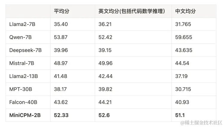 面壁MiniCPM模型在多项主流AI评测中展现出了卓越的性能。在自然语言处理(NLP)任务中,MiniCPM不仅能够准确理解和生成中英文文本,还能处理复杂的多模态输入,如图像加文本的联合理解任务。在与Mistral-7B以及其他同类大模型的比较测试中,MiniCPM在中英文平均成绩上均取得了领先。