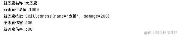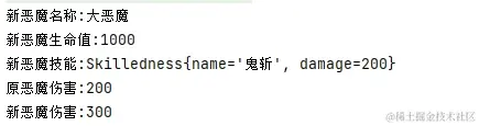System.out.println("新恶魔伤害:" + orge1.getSkilledness().getDamage());