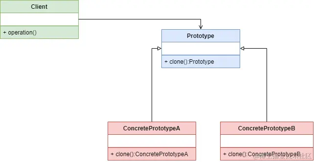 具体原型类实现了抽象原型类中声明的克隆方法,该方法返回一个自己的克隆对象 - Client: