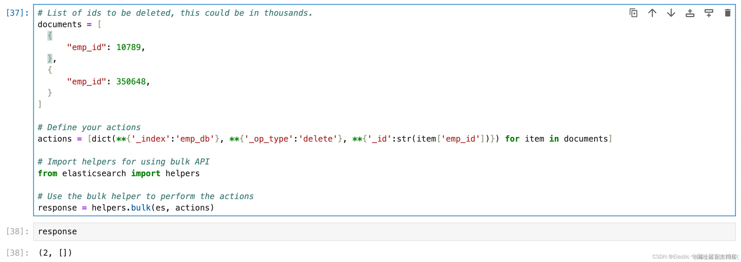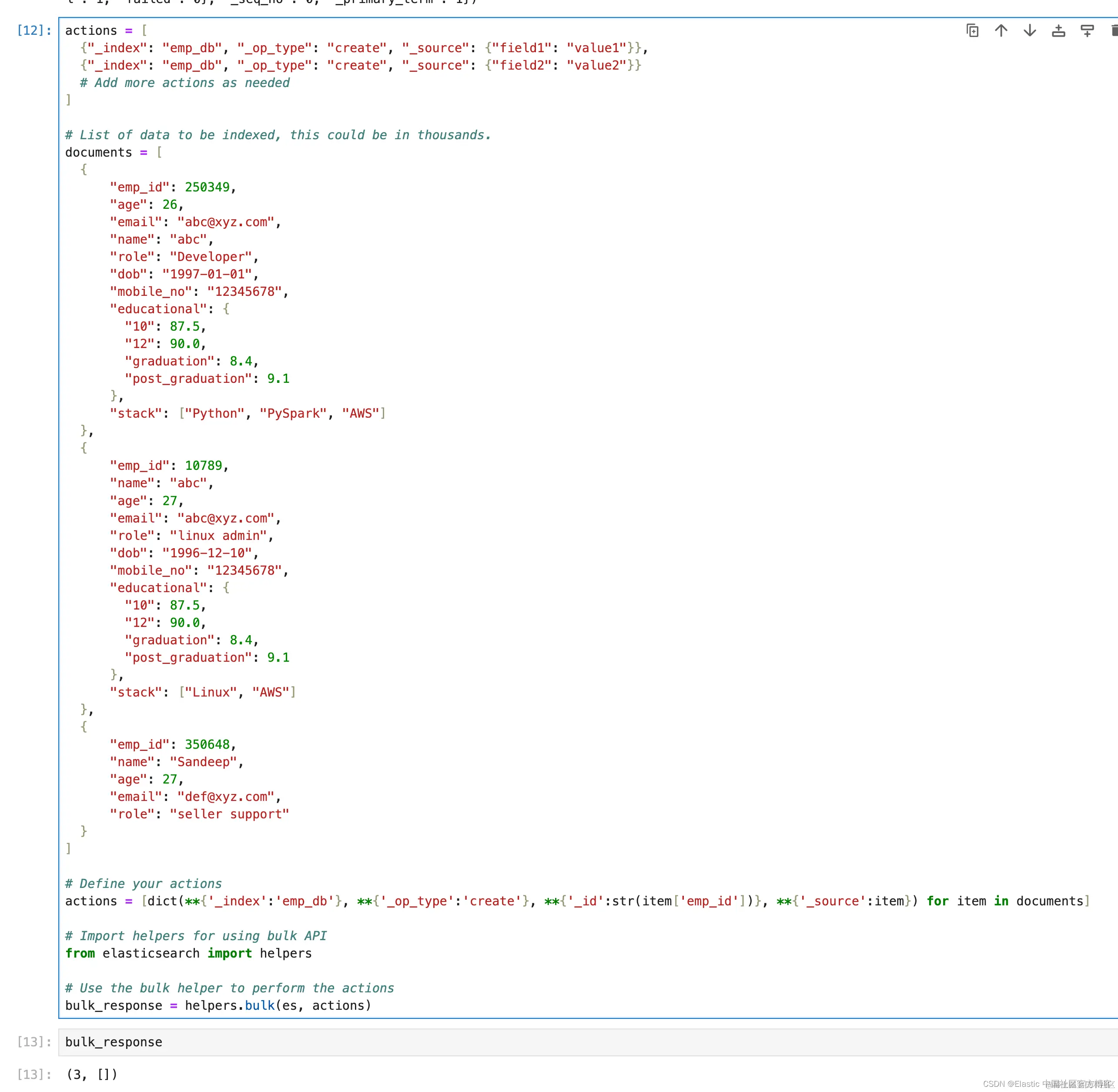 12. actions = [dict(**{'_index':'emp_db'}, **{'_op_type':'delete'}, **{'_id':str(item['emp_id'])}) for item in documents]