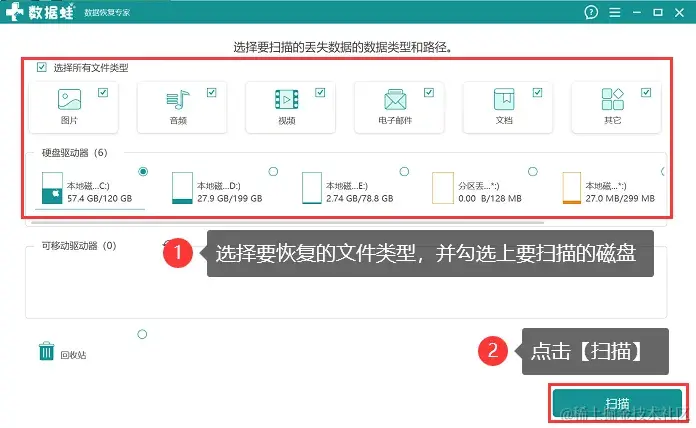 步骤2:在进入扫描界面后,用户可以勾选上需要扫描的文件类型和需要扫描的磁盘,并点击【扫描】;
