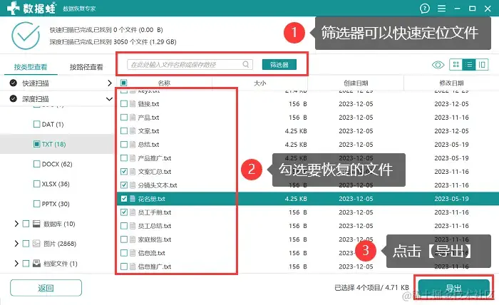 步骤4:在深度扫描结束后,用户可以再一次对需要扫描的文件进行查看和勾选,在选择时,如果所呈现的结果比较多,建议直接在【筛选器】定位相关文件,找到需要恢复的文件后,将它勾选上,点击【导出】 。