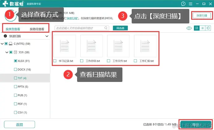 步骤3:在首次扫描完成后,用户可以根据实际需求选择按【类型】或者【路径】对文件进行查看,并对扫描结果进行查看和勾选,找到需要恢复的文件后,可以直接将其勾选上,如果没找到需要恢复的文件,点击【深度扫描】 ;