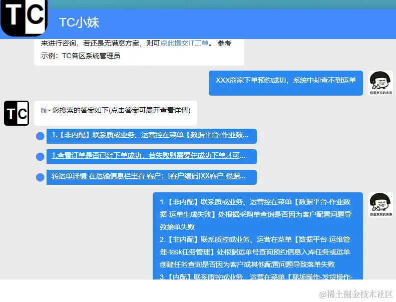 基于此种治理效果,基本上算是比较满意了(心里美滋滋),然而周而复始的值班进行在线解答与事后分析盘点,其实还是能看到咨询类的问题占比较多,纵横对比发现此时的咨询类问题提出人的所属部门很零散(销售、客服、运营、解决部、仓等等),问的问题也是“千奇百怪”,算是上述方案中的一些盲点区域了。基于此种特色,我们在想是否能够在系统中提供一个简易的问答检索功能来支持这些"边角"咨询类的问题的咨询,那么咱们说干就干。
