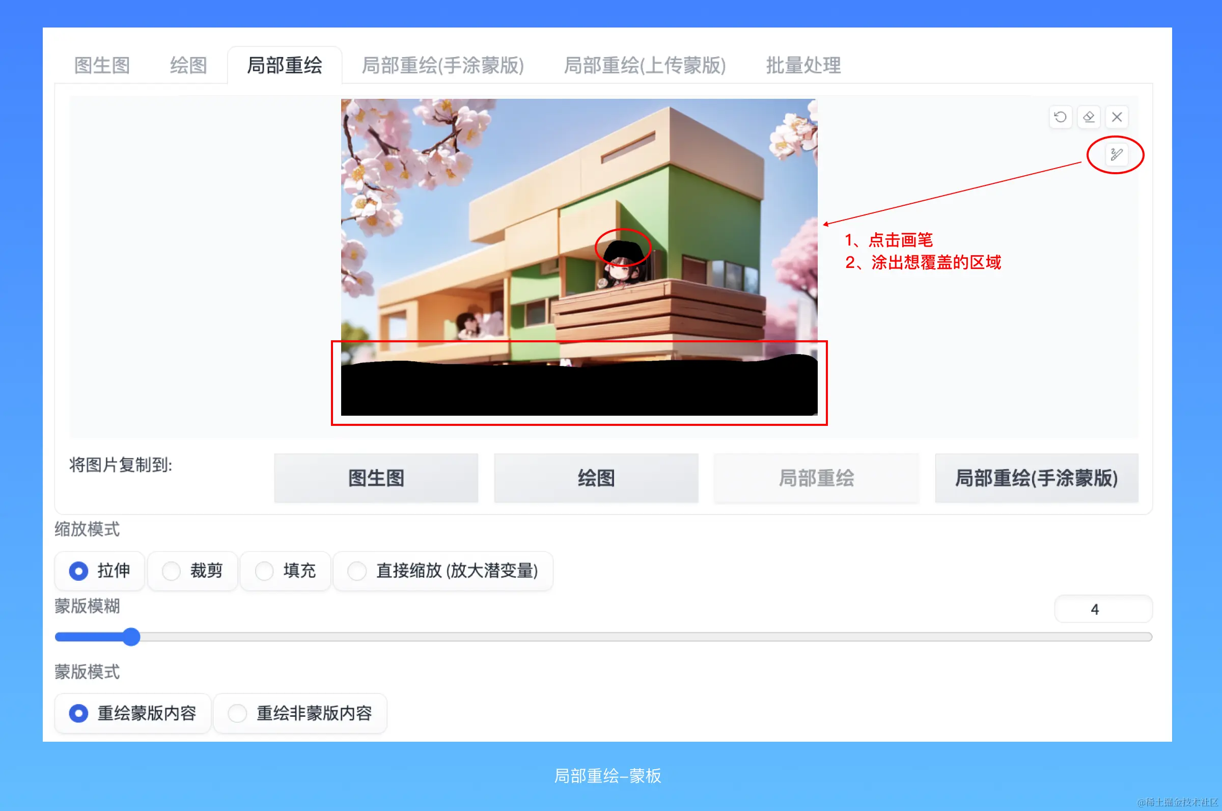 有一个小小的变化:当你把鼠标移动到图片区域上时,会出现一个画笔,使用它可以在图片上涂出黑色区域,覆盖住想要AI重画的地方。右上角有两个按钮,撤销、调节画笔的笔触大小。