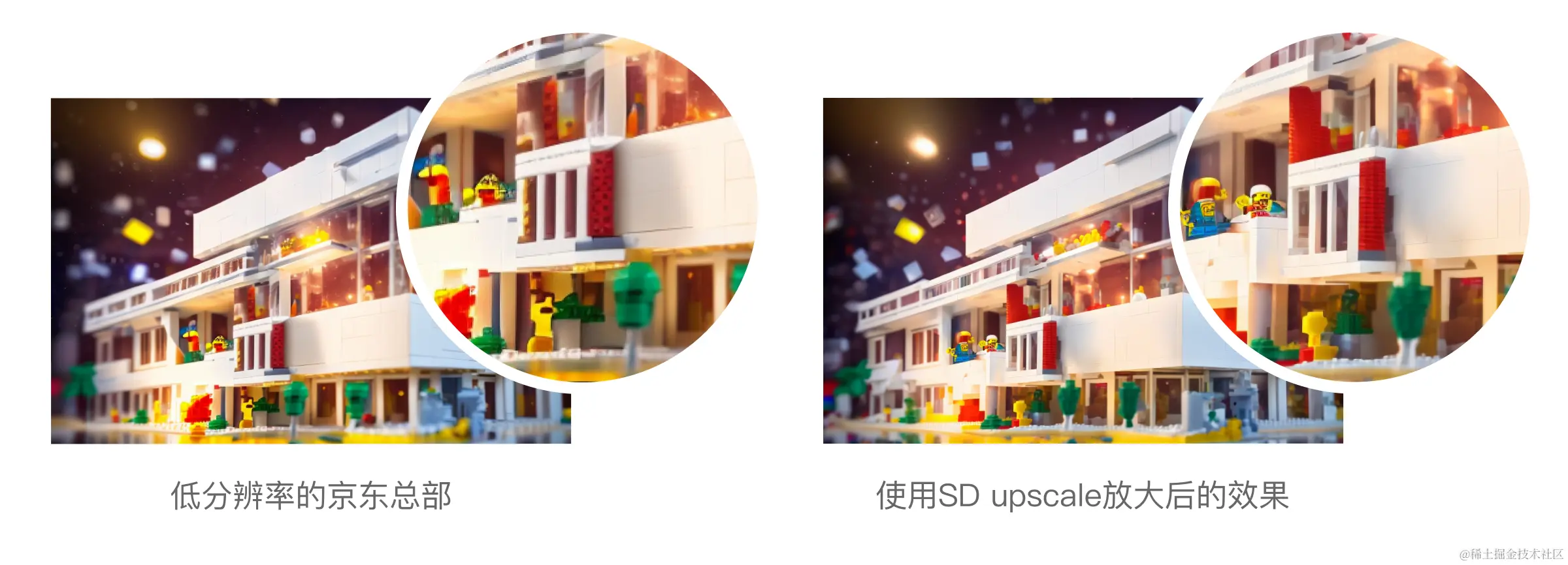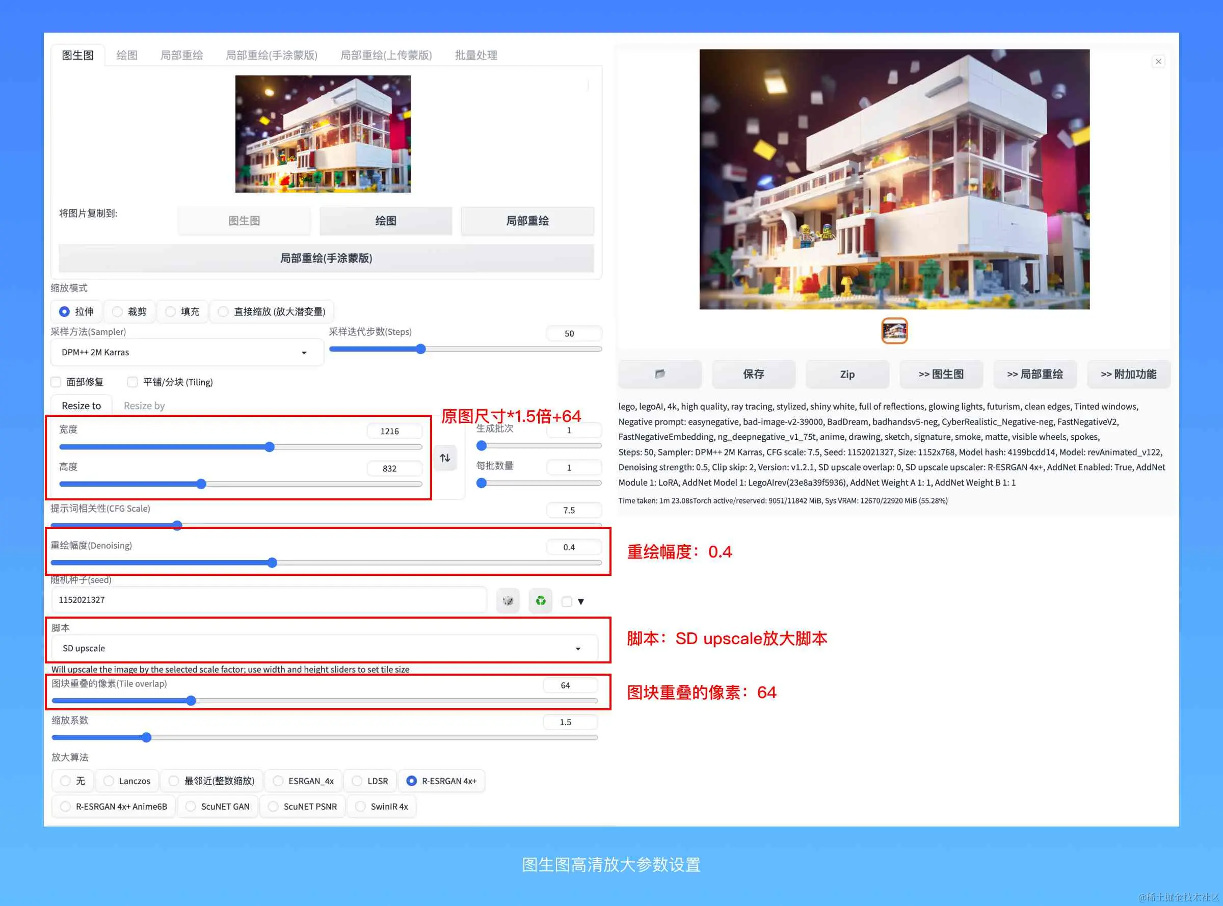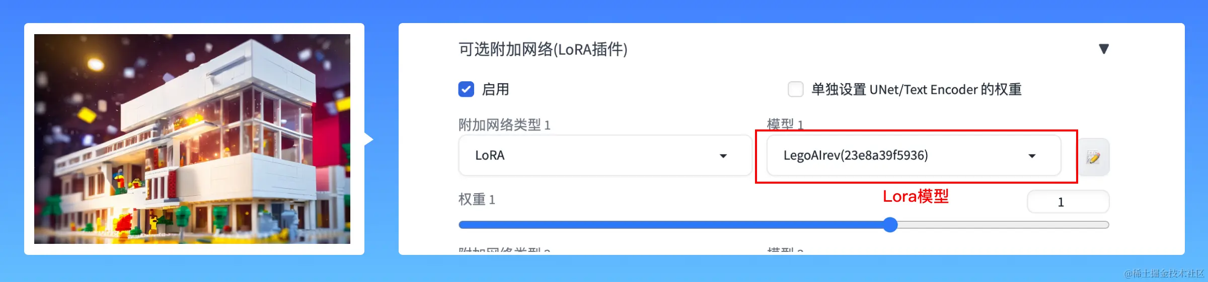 比如上面这张图,使用的lora模型是LegoAlrev,它可以让我们的总部大楼呈现出乐高积木的风格。