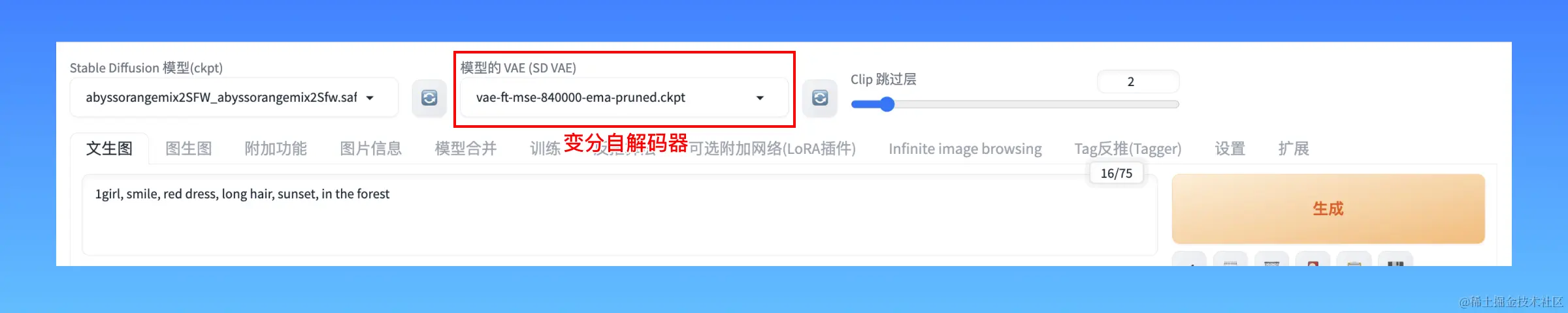 **VAE模型:**变分自解码器(Variational Auto Encoder),vae的作用是增强模型的色彩、光照等表现效果,相当于给模型加了美颜滤镜。所以如果你发现你的模型做的图发灰,检查一下vae文件是否勾选。目前多数比较新的模型,其实都已经把VAE整合进大模型文件里了,多数模型作者都会推荐他们认为合适的VAE,也有一些普遍适用于大多数模型的VAE,例如 kf-f8-anime。