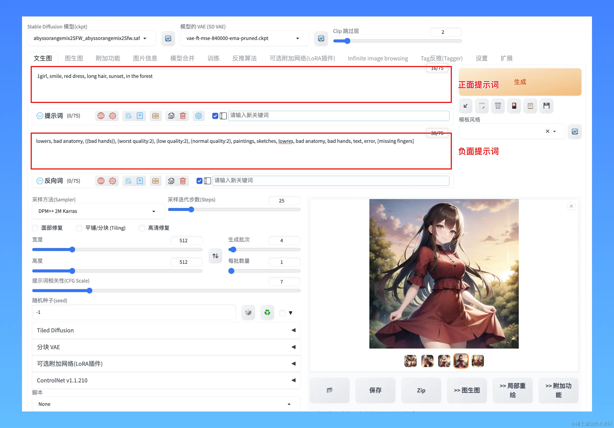 提示词分成两部分,一部分是正向的提示词,另一部分是反向提示词,分别用来控制你想要在画面里出现的、想排除在外的内容。