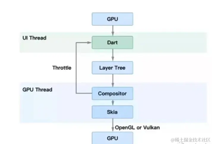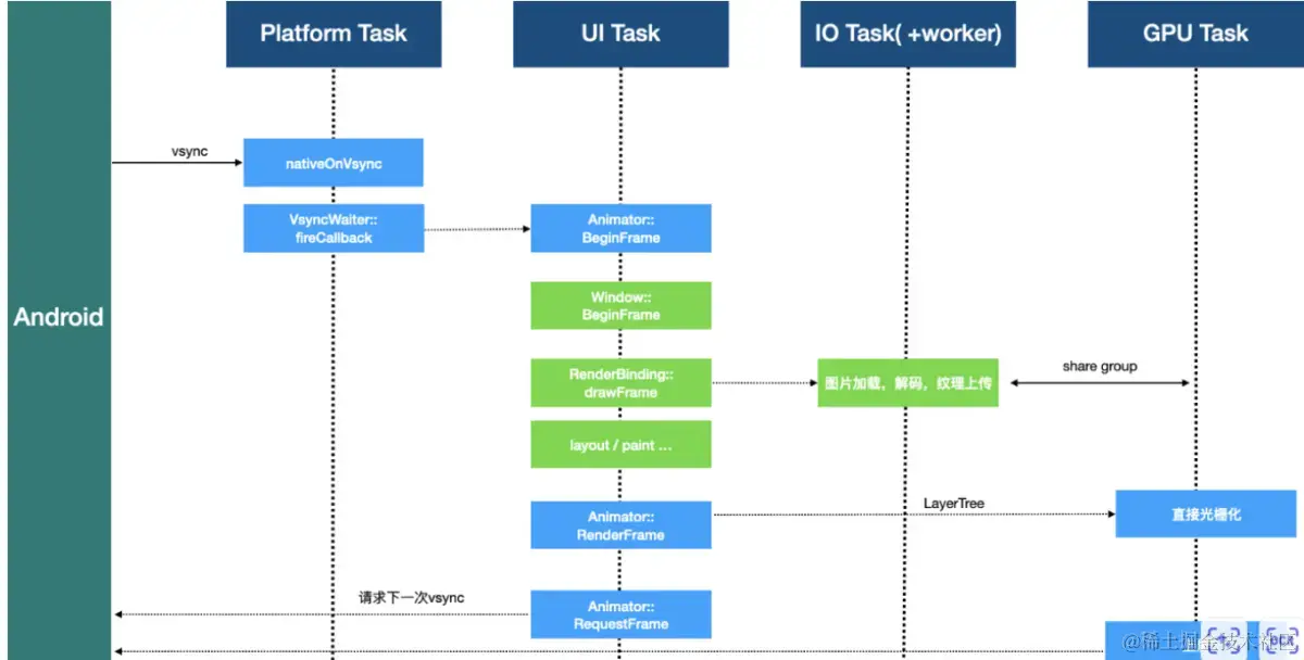 6). Dart 层绘制所产生的绘制指令以及相关的渲染属性配置都会存储在 LayerTree 中,通过 Animator::RenderFrame 把 LayerTree 提交到 GPU 线程,GPU 线程拿到 LayerTree 后,进行光栅化并做上屏操作(关于LayerTree我们后面会详细讲解)。之后通过 Animator::RequestFrame 请求接收系统下一次的Vsync信号,这样又会从第1步开始,循环往复,驱动 UI 界面不断的更新。