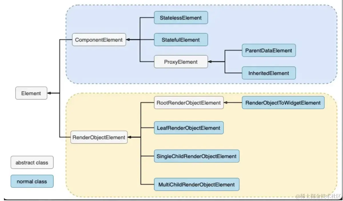 Element分为3种, ComponentElement和RenderObjectElement,ProxyElement, 前者负责组合子Element,后者负责渲染, 最后的是代理类