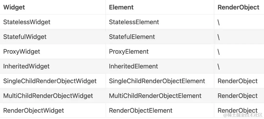 2). 渲染类: RenderObjectElement的主要子类:SingleChildRenderObjectElement、MultiChildRenderObjectElement、RenderObjectToWidgetElement。SingleChildRenderObjectElement