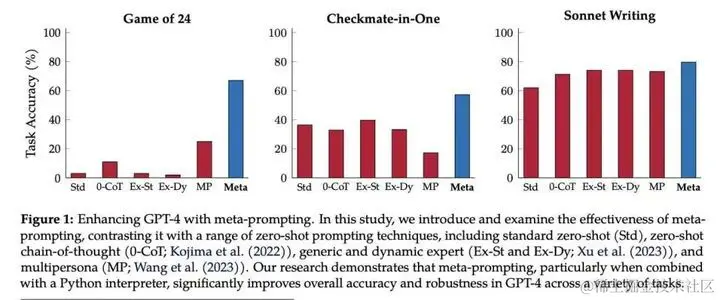 GPT-4 的实验显示了元提示相对于传统方法的优越性,在 Game of 24、Checkmate-in-One、Python编程难题等任务中,元提示比标准提示提高了 17.1%,比动态提示提高了 17.3%,比多人提示(MP)提高了 15.2% 。使用清晰的指令,元提示引导 LM 将复杂的任务分解为更小的子任务,然后由同一 LM 的专门实例处理,每个子任务都遵循定制的指令。