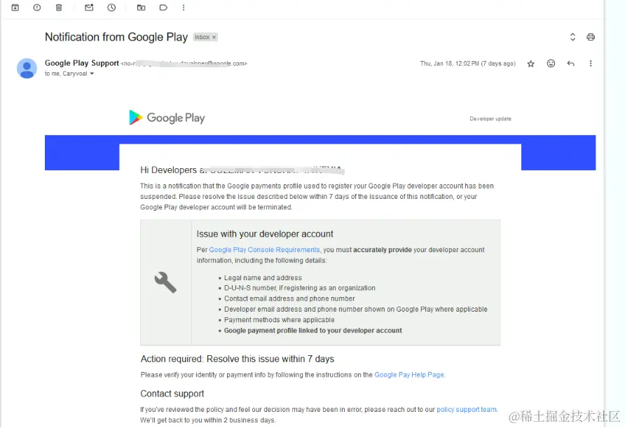 这是一条通知,表明用于注册您的 Google Play 开发者帐户的 Google 付款资料已被暂停。 请在此通知发出后 7 天内解决下述问题,否则您的Google Play 开发者帐户将被终止。