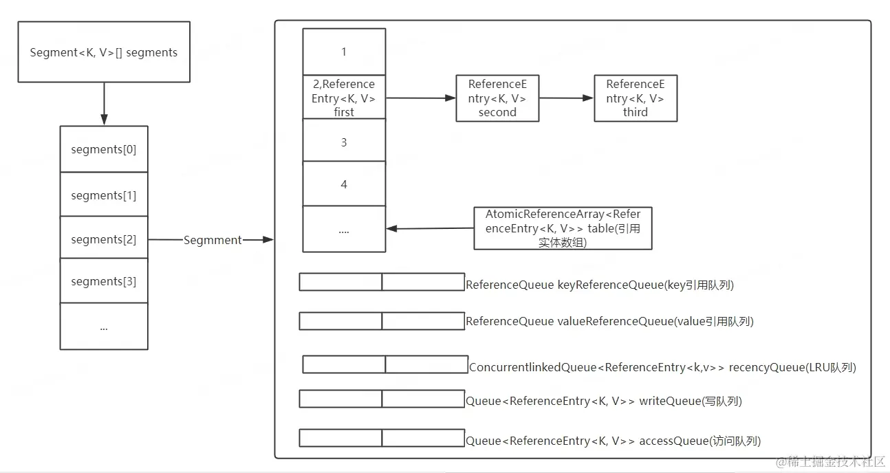 2、LocalCache 数据结构。缓存核心类 LocalCache 数据结构与 ConcurrentHashMap 很相似,由多个 segment 组成,且各 segment 相对独立,互不影响,所以能支持并行操作,每个 segment 由一个 table 和若干队列组成。缓存数据存储在 table 中,其类型为AtomicReferenceArray,具体结构图及代码解释如下。