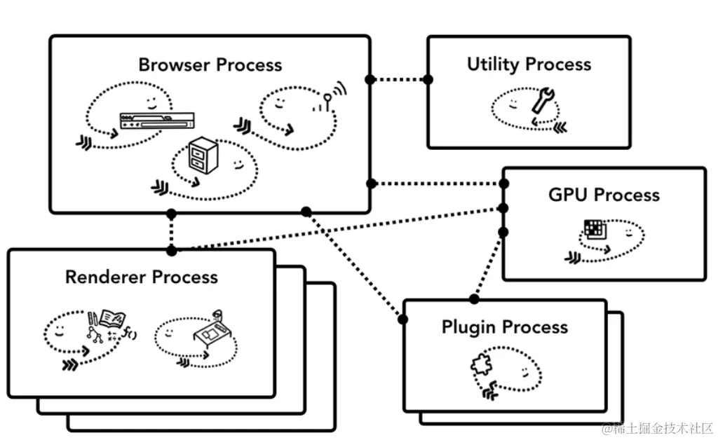 备注:Chrome 刚开始发布的时候是没有 GPU 进程的。而 GPU 的使用初衷是为了实现 3D CSS 的效果,只是随后网页、Chrome 的 UI 界面都选择采用 GPU 来绘制,这使得 GPU 成为浏览器普遍的需求。最后,Chrome 在其多进程架构上也引入了GPU 进程。