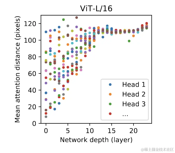 文章还观察了计算过程中各层 heads 的注意力权重,发现在最低的注意力层,有一些 heads 负责全局层面的处理。而有些 heads 负责局部层面的处理,而后者可能类似 CNN 中的卷积操作。但随着层数的增加,每个 head 都倾向于全局处理了。