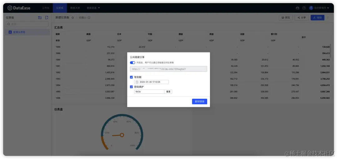 在DataEase v2.3.0版本中,新增“公共链接分享”功能,用户可以在仪表板和数据大屏的管理页面,对指定的仪表板或数据大屏创建供外部访问的公共链接。用户也可以为分享的仪表板或数据大屏公共链接设置有效期、访问密码等相关参数。