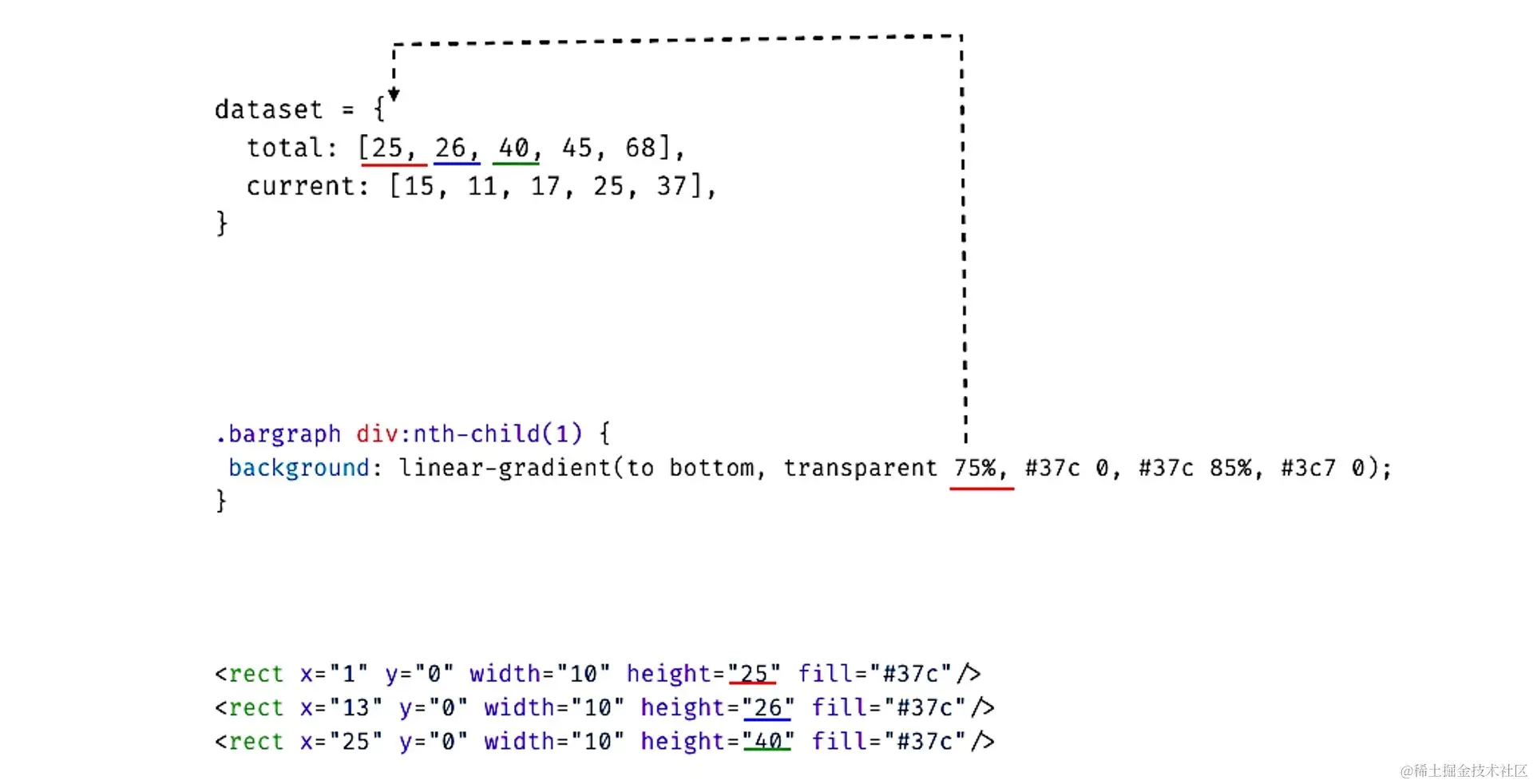 从上面的 SVG 代码中,可以一目了然地看出,数据 total 和 current 分别对应 SVG 中两个 g 元素下的 rect 元素的高度。也就是说,元素的属性和数值可以直接对应起来。而 CSS 代码并不能直观体现出数据的数值,需要进行 CSS 规则转换。具体如下图所示: