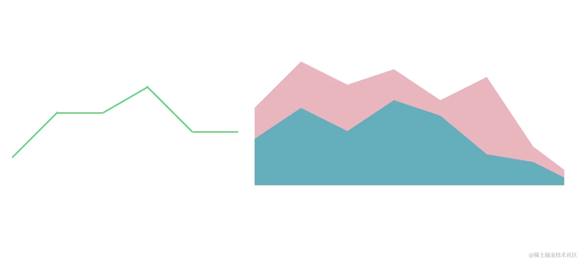除此之外,用 HTML 和 CSS 也可以实现折线图。可以用高度很小的 Div 元素来模拟线段,用 transform 改变角度和位置,这样就能拼成折线图了。另外,如果使用 clip-path 这样的高级属性,我们还能实现更复杂的图表,比如,用不同的颜色表示两个不同折线的面积。