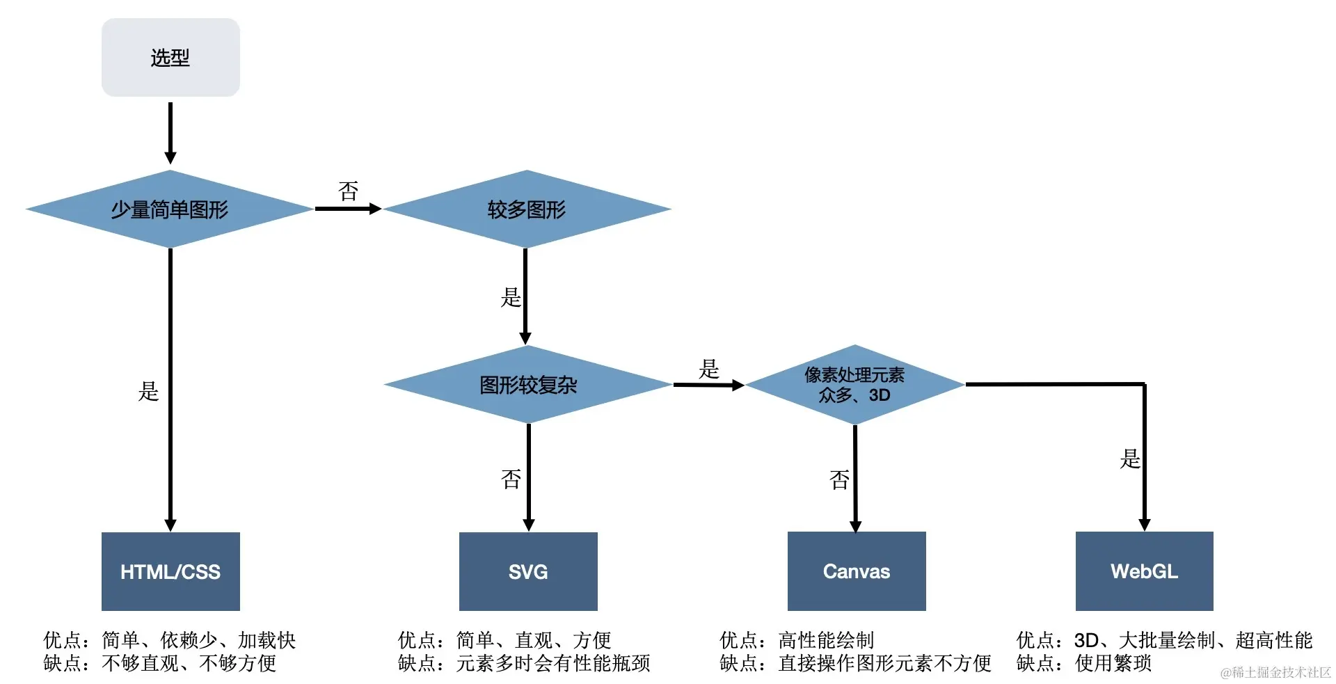 SVG 是对 HTML/CSS 的增强,弥补了 HTML 绘制不规则图形的能力。它通过属性设置图形,可以直观地体现数据,使用起来非常方便。但是 SVG 也有和 HTML/CSS 同样的问题,图形复杂时需要的 SVG 元素太多,也非常消耗性能。