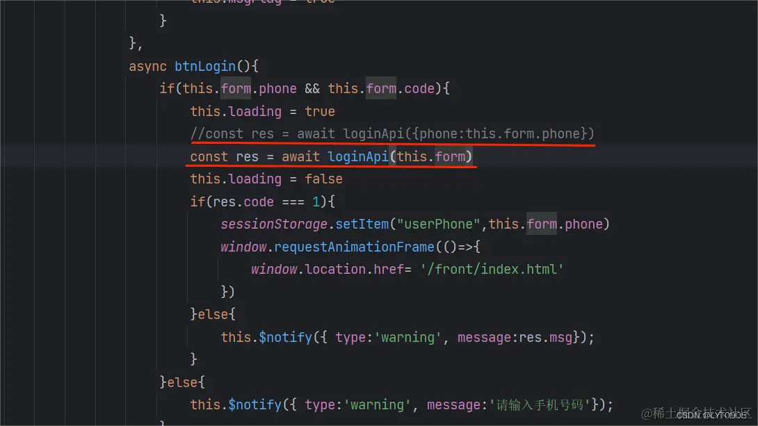 后面写完测试可能会发现一直报空指针异常,其实是登录的前端代码并没有穿两个参数,只传了phone参数,并没有传code,导致后端一直获取不到code,需要修改一下代码,同样也是在/page/login.html下